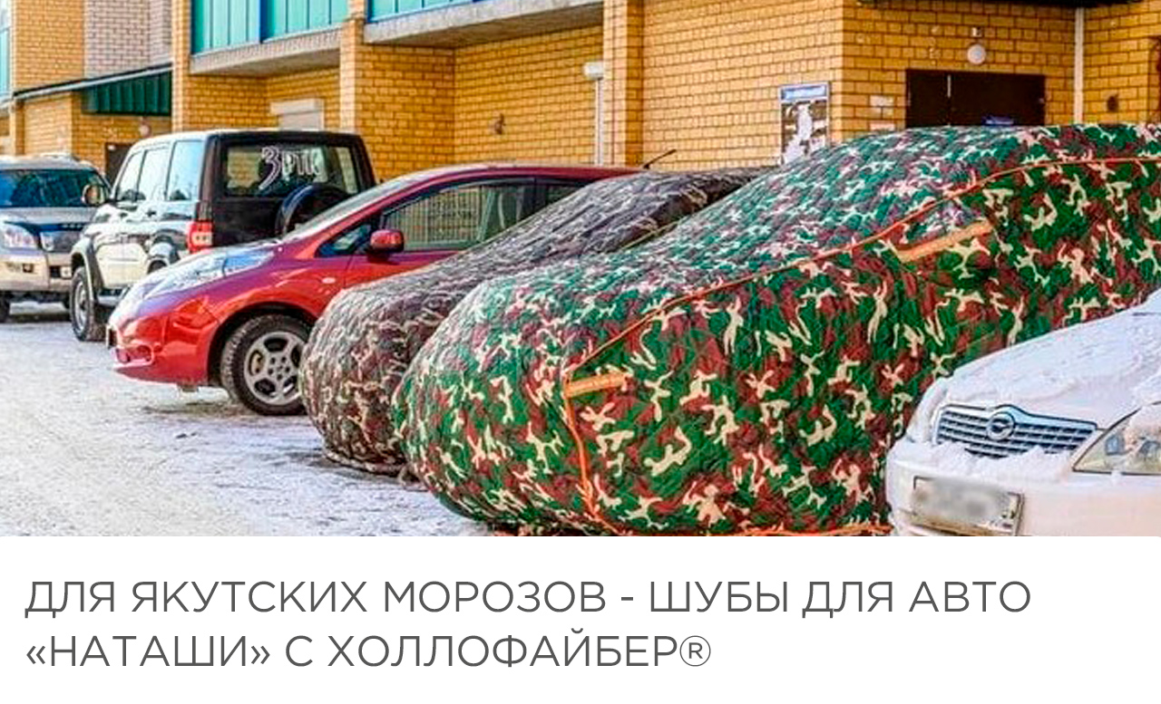 Это утеплённые неткаными материалами Холлофайбер® чехлы, которыми накрывают автомобили вне стационарных гаражей. Они получили необычное название «Наташи»: авто под ними могут при сильных морозах быть незаведёнными, отдыхать, не разморозиться, как поясняют разработчики.