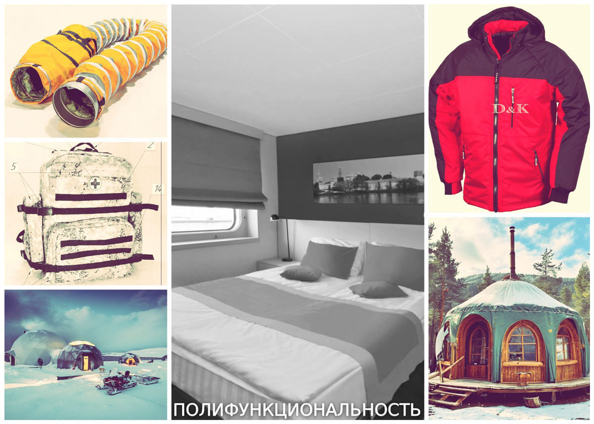 Спектр параллельного внедрения широк, говорится в статье, и авторы демонстрируют галерею практически безграничных разнополярных разработок нетканых материалов от имитации интерьерных облаков из кластерных волокнистых материалов до геокуполов для -60℃; от антибактериальных раневых повязок до бани-юрты; от огнестойкого спального мешка до индивидуальной арктической аптечки первой помощи; от БПЛА с корпусом с нетканой хардирующей основы до экранирующей капсулы для психологической коррекции ПТСР и пр.пр.пр.