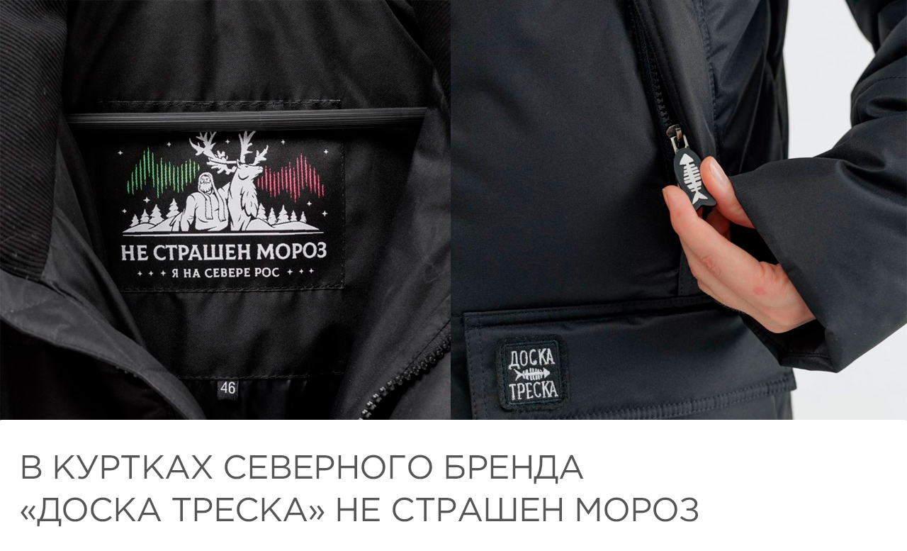 Архангельский локальный бренд «Доска Треска», разработавший удлинённую унисекс-куртку с «Холлофайбер», утверждает: «Не страшен мороз, я на Севере рос!»