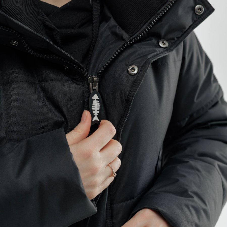 Унисекс-куртка снабжена лаконичным шевроном «Доска Треска» и фирменной рыбкой на слайдерах молний.